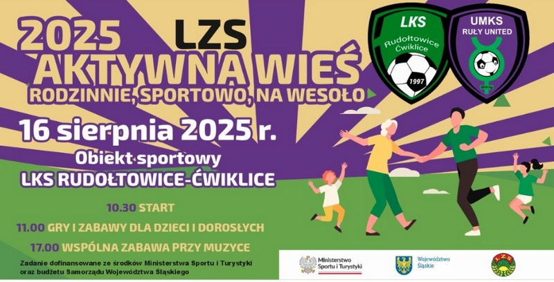 Serdecznie zapraszamy na imprezę sportowo-rekreacyjną: Aktywna Wieś – Rodzinnie, sportowo, na wesoło<,strong> w dniu 16 sierpnia 2025 r. w Rudołowicach, ul. Wolności.
