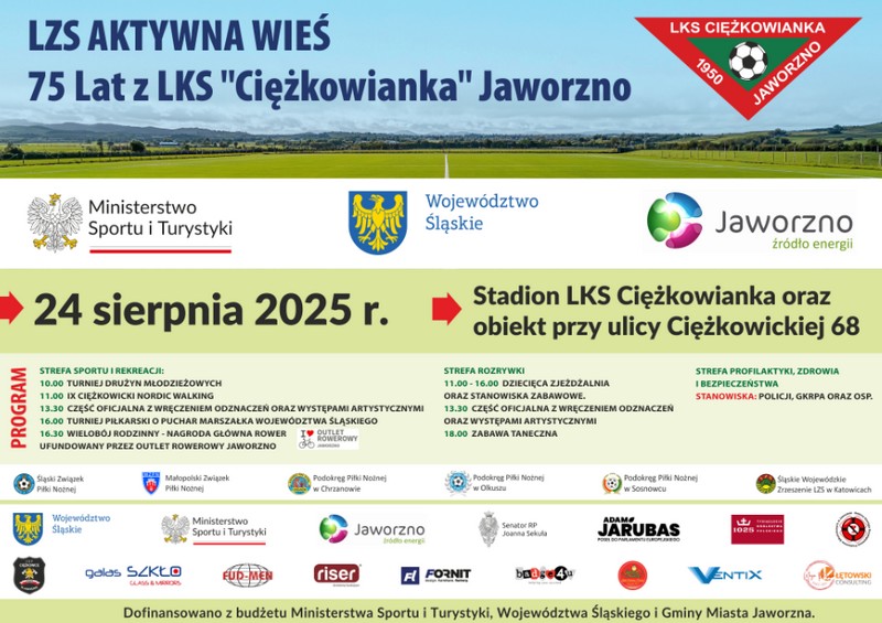 Serdecznie zapraszamy na imprezę sportowo-rekreacyjną: Aktywna Wieś 75 lat z LKS „Ciężkowianka” w dniu 24 sierpnia 2025 r. w Jaworzno - Ciężkowice, ul. Ciężkowicka 68.