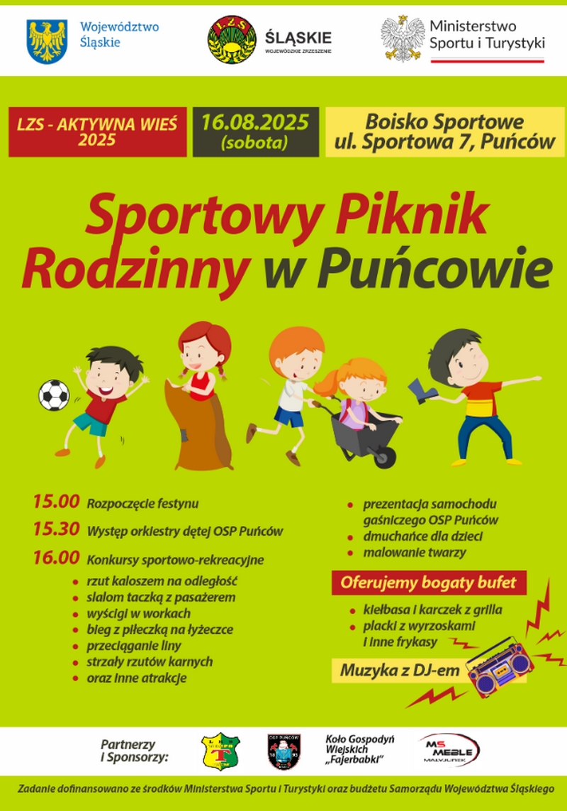 Serdecznie zapraszamy na imprezę sportowo-rekreacyjną: Aktywna Wieś - Sportowy Piknik Rodzinny w Puńcowie w dniu 16 sierpnia 2025 r. w Puńcowie, ul. Sportowa 7.